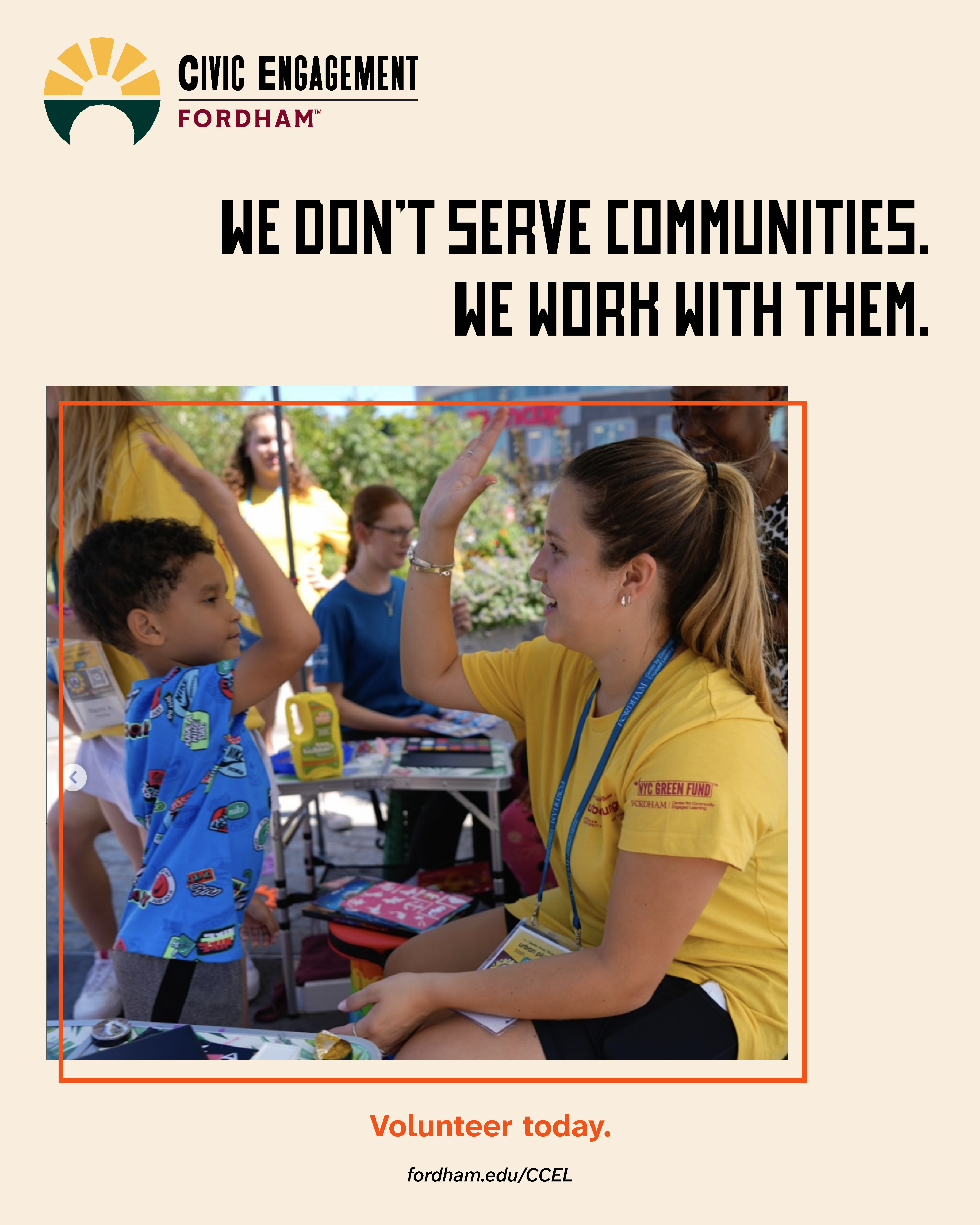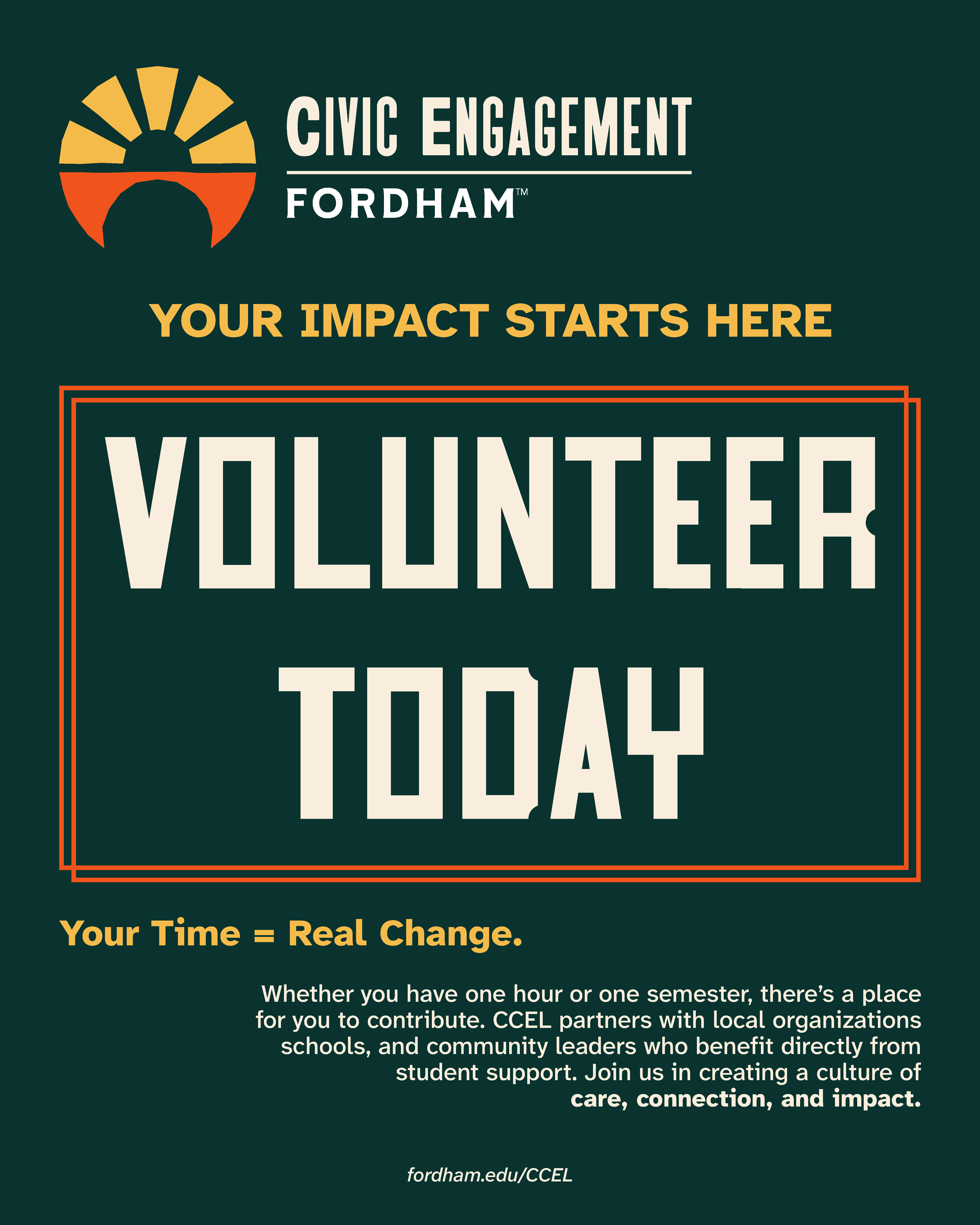 The Center for Community Engaged Learning (CCEL) connects Fordham University with local and global communities through experiential learning and reciprocal partnerships that integrate academic inquiry with civic engagement to advance justice, solidarity, and social responsibility.